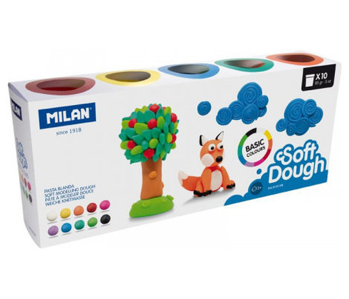 Pasta de modelar blanda "Soft Dough". Una pasta consistente y elástica, fácil de modelar. Contiene 10 colores: blanco, amarillo, naranja, rojo, rosa, lila, azul, verde claro, verde y negro. Se pueden crear nuevos tonos combinando dos o más colores. Nodeja residuos en las manos. Almacenada en botes de 85 g con tapa transparente apilables entre sí. Ingredientes de origen vegetal.
