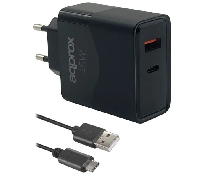 CARGADOR USB DE VIAJE/PARED 1xUSB/USB-C + CABLE USB-A A USB-C 45W NEGRO APPROX (Espera 4 dias)