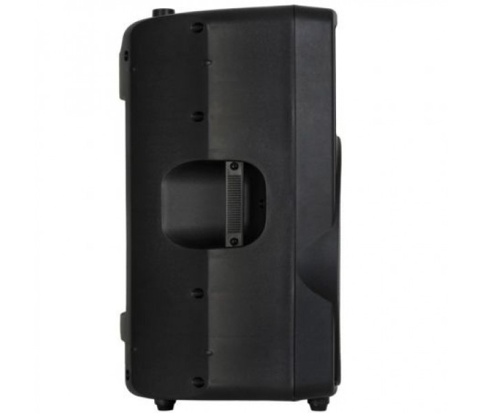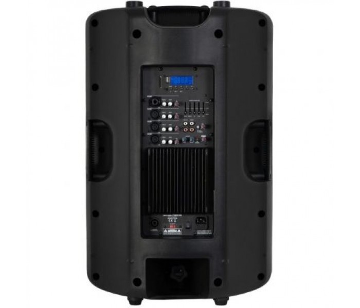 Altavoz autoamplificado con caja de inyección PP extra resistente. Reproductor USB/SD/MP3 con mando a distancia. Salida para pantalla pasiva. Woofer protegido con rejilla metálica frontal. Asas de transporte, puntos de suspensión, patas para suelo y forma de monitor. Orificio en la base para tubo de 35 mm.