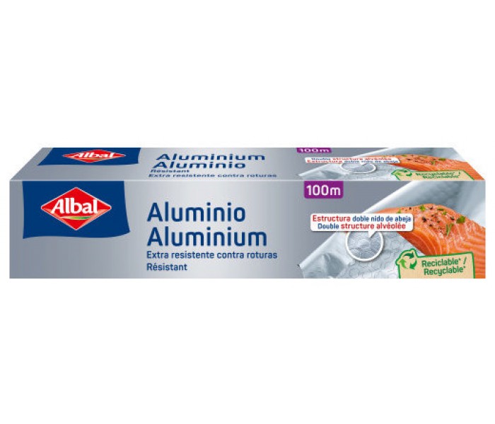 Rollo de papel de aluminio Albal de 100 metros. Resistente y versátil, ideal para conservar alimentos, cocinar al horno y proteger superficies.