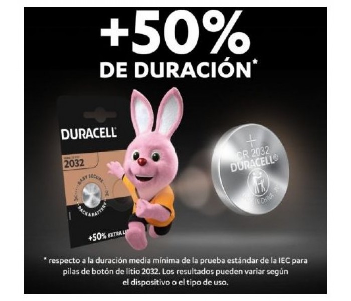 PILAS DURACELL DE BOTÓN DE LITIO 2032: HASTA UN 50 % MÁS DE DURACIÓN*Tecnología Baby Secure: Incorpora una capa no tóxica con forma de anilla y sabor amargo con Bitrex® en la parte posterior de la pila para disuadir a niños y bebés de ingerir el producto.