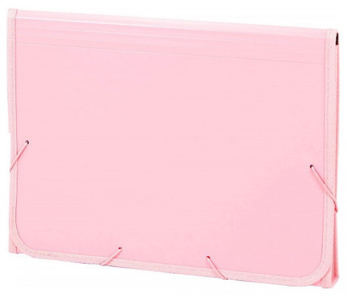 Acordeón de polipropileno Soft reforzado con ribete de tela en todo su contorno color a juego. Color rosa pastel.Con 13 departamentos interiores de polipropileno transparente con fuelle tipo acordeón. Incluye etiquetas para identificar el contenido de cada departamento.Goma redonda de cierre del mismo color.Apropiado para todo tipo de documentos tamaño Folio.