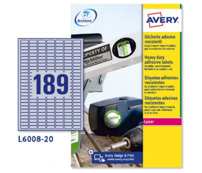 Etiquetas en poliéster plata ultra resistentes adhesivo permanente.Resisten a agentes químicos, abrasiones, no se desgarran, rayos UV, aguas y temperaturas extremas de -40àC a +150°C.Para impresora láser.Medida de la etiquetas 25,4x10mm.Contenido: 3780 etiquetas por caja (189 etiquetas por hoja y 20 hojas por caja).