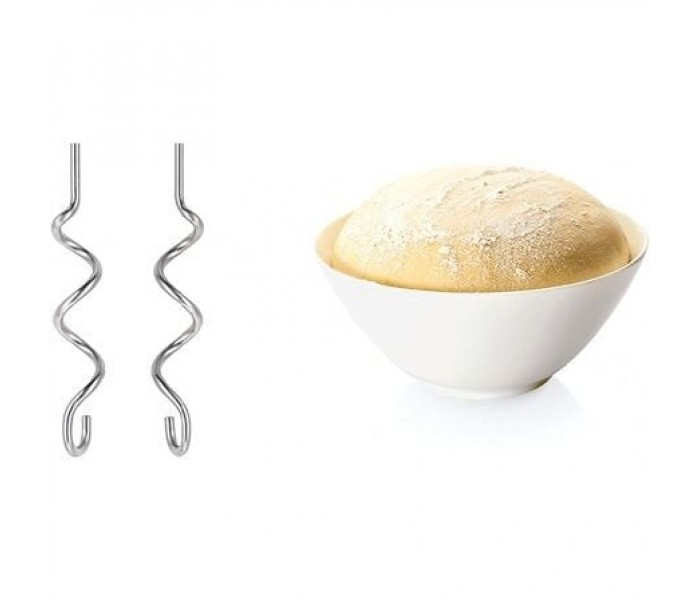 Equipada con dos varillas batidoras y dos garfios amasadores.
