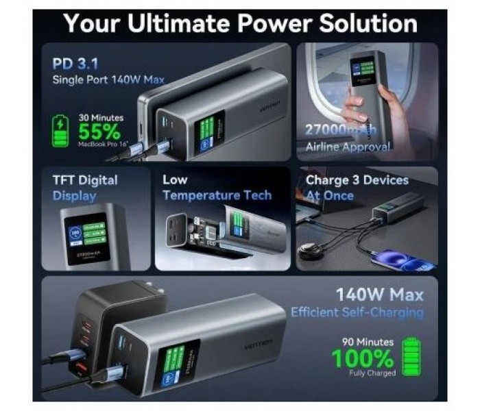 Este cargador portátil permite una carga rápida bidireccional de hasta 140W, ideal para portátiles como el MacBook Pro 16". Carga un MacBook Pro al 55 % en solo 30 minutos mediante el puerto de 140W. También ofrece una carga rápida y eficiente para el propio power bank.