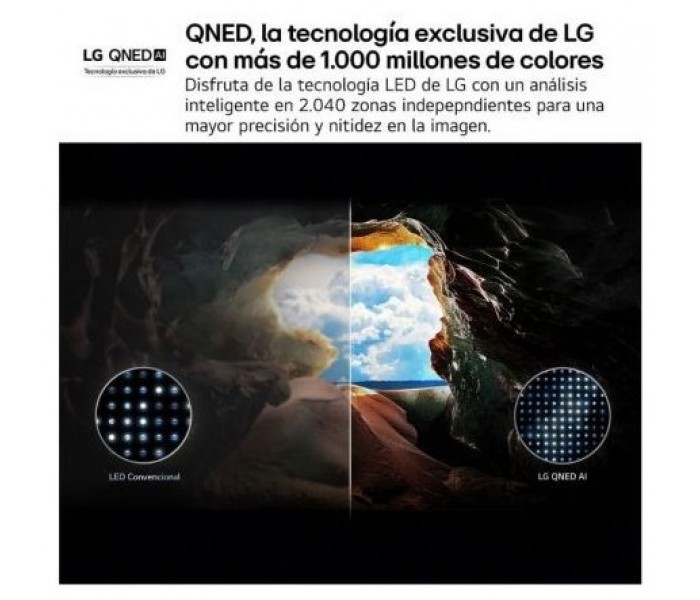 - Más de 1.000 millones de colores, ahora más intensos que nunca con LG QNED, la tecnología exclusiva de LG. Mayor contraste y brillo en la imagen, gracias al análisis inteligente de Dynamic Tone Mapping en 2.040 zonas independientes.