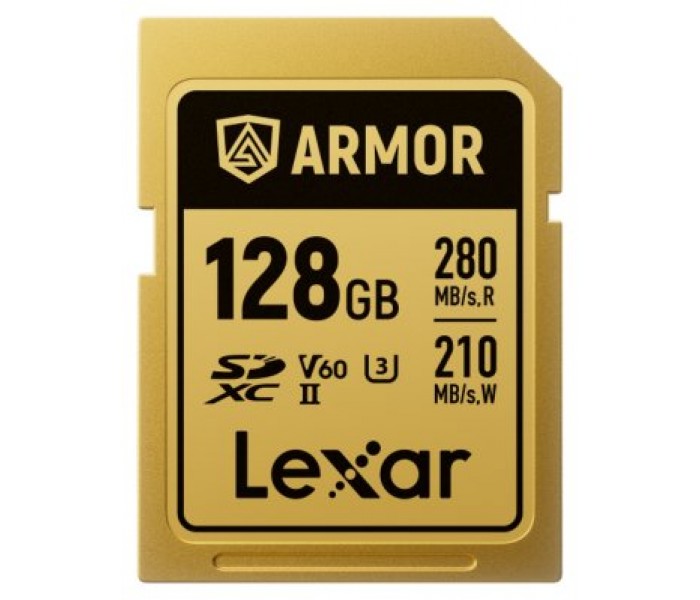 Lexar Armor Gold. Capacidad: 128 GB, Tipo de tarjeta flash: SDXC, Tipo de memoria interna: UHS-II, Velocidad de lectura: 280 MB/s, Velocidad de escritura: 210 MB/s, Clase de velocidad UHS: Class 3 (U3), Clase de velocidad de vídeo: V60. Funciones de protección: Protección contra caídas, Resistente al polvo, Resistente a la presión, Resistente al agua, Color del producto: Oro