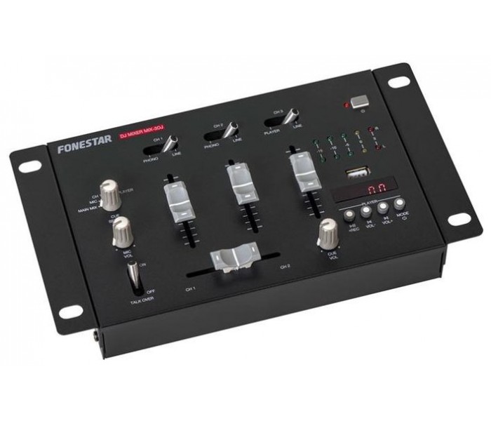 mezclador dj compacto de 3 canales estéreo y 1 micrófono.