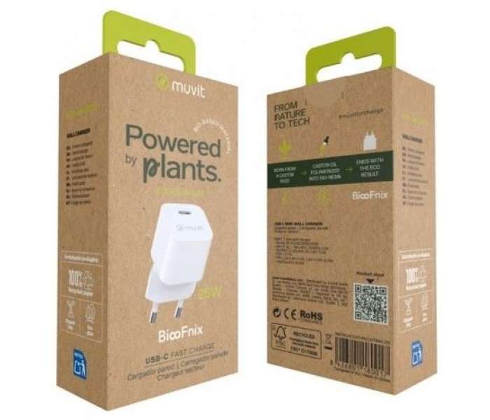 El cargador de pared muvit for change BiooFnix 25W representa una nueva generación de tecnología más respetuosa con el planeta. Fabricado a partir de aceite de ricino transformado en bioresina, este cargador nace literalmente de una semilla, como símbolo de innovación sostenible y compromiso medioambiental.