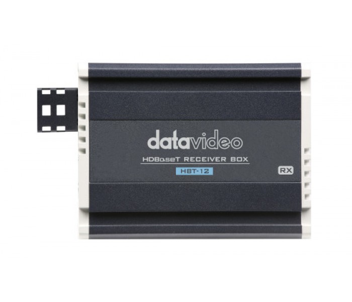 DataVideo HBT-12. Tipo: Receptor AV, Máxima resolución: 3840 x 2160 Pixeles, Tipos de cable soportados: Cat7. Tecnología de conectividad: Alámbrico. Alimentación: CC, Voltaje de operación: 56 V, Consumo energético: 65 W. Ancho: 85 mm, Profundidad: 132 mm, Altura: 45 mm. Cantidad por paquete: 1 pieza(s)