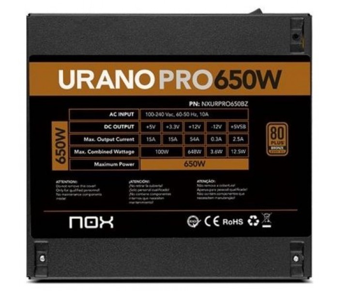Urano PRO es la nueva serie de fuentes con certificado 80 PLUS Bronze de Nox. Estas fuentes de alimentación han sido diseñadas para garantizar una eficiencia del 85%, brindando una auténtica potencia continua al máximo rendimiento de las configuraciones para entusiastas y profesionales.