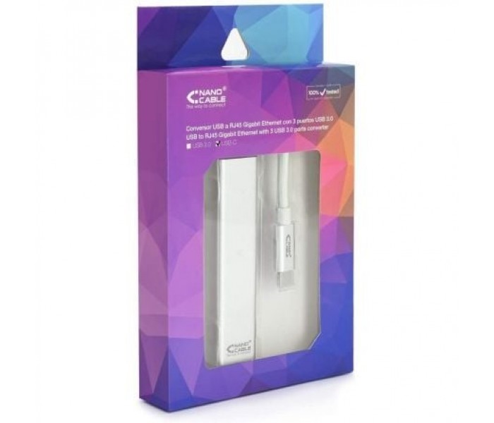 - Conversor USB-C a Ethernet Gigabit con 3 puertos USB 3.0, con conector USB-C macho en un extremo, conector RJ45 hembra y 3 puertos USB 3.0 hembra en el otro.