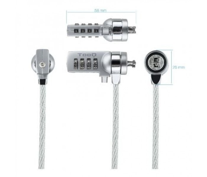Especificaciones:. . Universal y fácil de usar. Cable de acero de 1.5 metros de longitud y 4.5mm de diámetro. Bloqueo con combinación de 4 dígitos. Válido para pantallas y dispositivos con ranura de seguridad tipo Kensington. Material del candado: acero galvanizado con revestimiento de vinilo transparente y llave de aleación de zinc. Color: Plata. Peso neto: 0,13 kg. Peso bruto: 0,16 kg. Medidas del embalaje: 210x150x30 mm