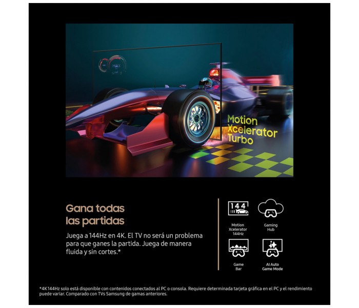 - Prestaciones de juego: Modo automático de baja latencia (ALLMˌ Auto Low Latency Mode), Dynamic Black EQ, Game Motion Plus, Gaming Hub, HGiG, Mini Map Zoom, Super Ultra Wide Game View, Surround Sound, Frecuencia de actualización variable (VRRˌ Variable Refresh Rate)