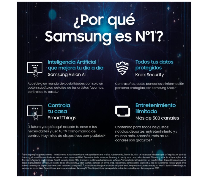 - Tecnologías Samsung (AV/TV): 4K AI Upscaling Pro, AI Motion Enhancer Pro, Adaptive Sound Pro, Ambient Mode, Auto HDR Remastering Pro, Built-in SmartThings Hub, EyeComfort Mode, LaserSlim Design, Multiple Voice Assistants, Procesador NQ4 AI Gen3, Object Tracking Sound Lite, Q-Symphony