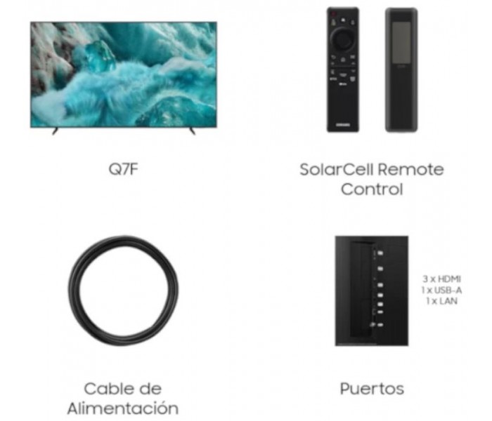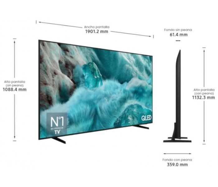 | Características | Smart TV - Sistema operativo: Tizen - Bixby - Asistente de voz integrado: Alexa y Google - Experiencia multidispositivo: Móvil a TV, inicio de duplicación de TV, duplicación de sonido, TV inalámbrica activada - Vista múltiple: Hasta 2 vídeos - AppleAirPlay: Sin Islas Aland, Islas Feroe, Antillas Neerlandesas, San Marino - Diario+ - Almacenamiento compartido - Fondo de pantalla generativo - Micrófono de karaoke Recepción - Transmisión digital: DVB-T2CS2 - Sintonizador analógico - Interfaz Común: CI+(1.4) / CI+(1.4 ECP)_IT solo - Transmisión de datos: HbbTV 2.0.4 (IT,GB,DE,CZ,SK,ES,PL,AT,FR,FI,EE,GR,SI,HR,BE,NL,LU,HU,CH,PT,DK,ME) - TV Key Sonido - Sonido de seguimiento de objetos: OTS Lite - Q-Sinfonía - Descriptor de preselección de audio - Salida de audio (RMS): 20W - Tipo de altavoz: 2 canales - Sonido adaptativo Alimentación - Fuente de alimentación: AC220-240V~ 50/60Hz - Consumo de energía (máx.): 275 W - Clase de eficiencia energética: G - Consumo de energía (Stand-by): 0.50 W - Consumo de energía (Estándar): 162 W - Consumo de energía anual (EU standard): 225 kWh - Apagado automático - Ahorro automático de energía Dimensiones y peso - 1901,2 x 1132,3 x 359 mm - 33,1 kg Accesorios - Control remoto (TM2360E) - Manual de usuario - Cable de corriente |