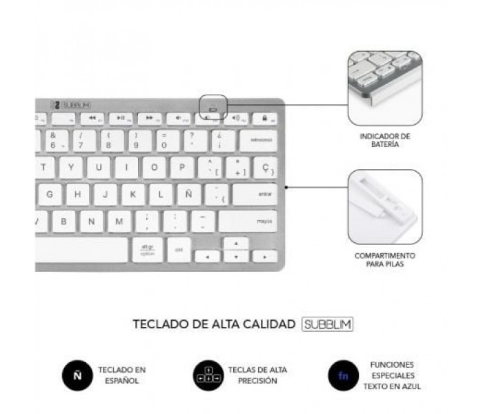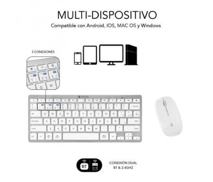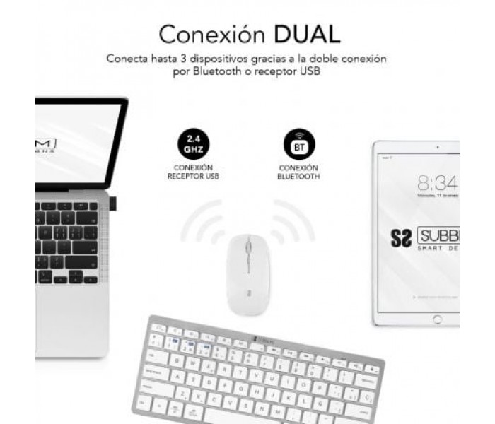 Crea un espacio minimalista, moderno y silencioso con la compacta combinación con tecnología inalámbrica Bluetooth y además por radio frecuencia 2.4G. El Combo Multidispositivo de Subblim, compuesto de un teclado y un ratón de diseño avanzado de alta precisión de hasta 1600DPI, son. perfectos para hacer las tareas con eficacia y permite una productividad constante.. El tamaño de la combinación facilita el trabajo en los espacios de escritorio más reducidos y resulta la pareja perfecta para usarlos cuando estás de viaje o en reuniones de trabajo.. . Características:. . Triple conexión. . El Combo de Subblim es ideal si deseas disfrutar de la libertad de trabajar con varios dispositivos a la vez. Su funcionalidad de emparejamiento triple le permite conectar hasta tres dispositivos al teclado, dos mediante tecnología inalámbrica Bluetooth y otro mediante radio. frecuencia 2.4G. Podrás conectar de forma simultánea el Ordenador portátil, el teléfono móvil y la Tablet cambiando entre ellos de una forma muy sencilla.. . Práctico Control. . Con doce teclas de funciones multimedia*, tendrás accesos directos a tus funciones favoritas al alcance de tu mano. Cambia fácilmente entre las funciones más utilizadas para cada sistema operativo, ya sea a tu PC con Windows, iPhone o dispositivo Android. Tendrás acceso. rápido a los controles del dispositivo para iOS y Android, como el botón de inicio, activar la función de búsqueda, tomar instantáneas, controlar tus medios o bloquear tu dispositivo. *La compatibilidad de las teclas de función varía según el sistema operativo. . Diseño ergonómico y silencioso. . El mecanismo de tijera de las teclas hace que escribir sea cómodo y muy receptivo. El ángulo del teclado proporciona soporte para la muñeca para un trabajo sin dolor durante largos períodos de tiempo. El mouse silencioso y su clic muy suave garantizan un ambiente tranquilo y sereno.. . Estilo elegante y compacto. . Las teclas son planas y elegantes, estilo Mac. Este diseño ahorra espacio en su escritorio. El mouse, con su línea elegante y acabado plano, agrega un toque de elegancia a su escritorio.. . Ratón. . El elegante ratón inalámbrico con batería de litio recargable de alta duración, tiene 3 niveles de DPI ajustables (800/1200/1600), para que pueda elegir la velocidad correcta del puntero en función de sus actividades como por ejemplo trabajo, juegos o uso en una pantalla de TV.. . Especificaciones:. . Conectividad inalámbrica multidispositivo. El Teclado Inalámbrico Subblim soporta 3 dispositivos mediante dos canales con tecnología inalámbrica Bluetooth 5.2 y uno a través de un receptor USB RF 2.4G. El ratón soporta 2 dispositivos, un canal con tecnología inalámbrica Bluetooth 5.2 y uno a través del receptor USB. El receptor USB se comparte entre el teclado y el ratón unificando ambos y ocupando solo un puerto del dispositivo.. Cambia entre los diferentes dispositivos muy fácilmente pulsando el selector de modo en el teclado y el ratón.. Es el más adecuado para el hogar, la oficina, para el uso su teléfono inteligente, ordenador portátil, iPad, Tablet Android o Windows, consolas de videojuegos o Smart TV.. Funcionamiento silencioso. Las teclas silenciosas y precisas proporcionan una escritura táctil natural con un menor ruido. Diseñado para una mayor productividad y portátil para una entrada de datos eficiente.. El ratón de alta precisión de hasta 1600DPI también tiene los botones silenciosos y batería recargable de alta duración.. Diseño del Teclado en Español y Ratón Ultra-Slim. Compatible con dispositivos Windows® 8/10/11, Android™, iOS/iPadOS 13 y MacOs