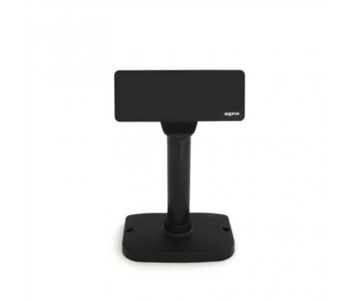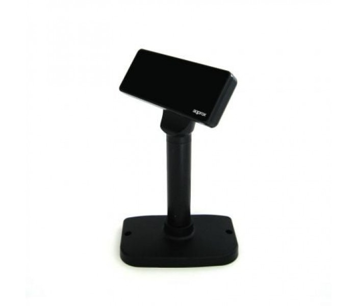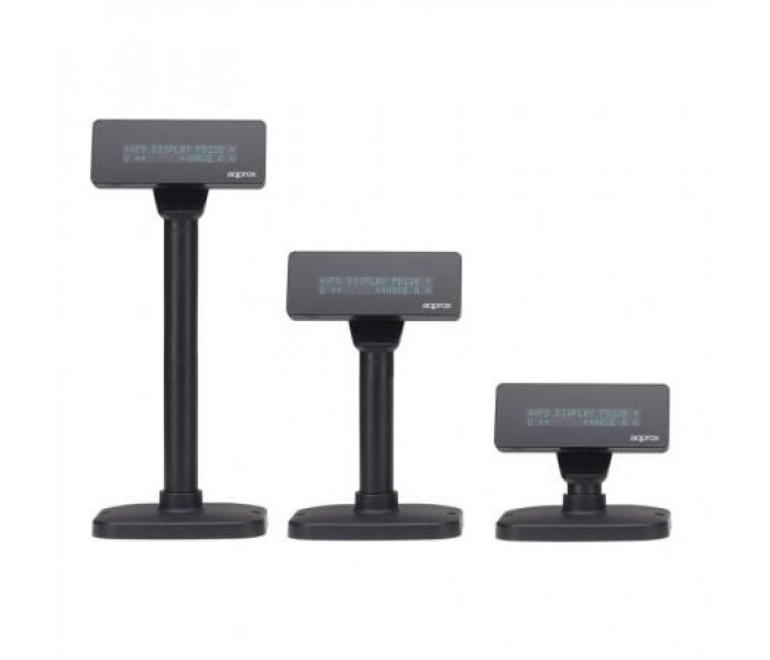 Visor de cliente alfanumérico fluorescente al vacío.. Visor de cliente para punto de venta, de 20 caracteres y 2 líneas, ideal para informar al cliente del los datos más relevantes del proceso de compra, marcando unidades y precios de los productos a medida que pasan por el lector de códigos.. El visor appVFD01 destaca por su funcionalidad y adaptabilidad a diferentes entornos, permitiendo una configuración a tres alturas y una rotación del cabezal máxima de 355º.. Especificaciones:. • Visualización: Pantalla fluorescente al vacío. • Nº de caracteres: 40 (20 columnas x 2 líneas). • Brillo: 500 - 1.000 cd/m2. • Tipo de carácter: 95 Alfanuméricos, 32 caracteres internacionales. • Tamaño del carácter: 6.7 (H) x 3.7 (W) mm.. • Tamaño del punto (X x Y): 0.80 x 0.70 mm.. • ángulo de visión: Max. 60º. • Rotación horizontal: Max. 355º. • Modo de comandos: LD220, EPSON POS D101, AEDEX, UTC/S, UTC/P, ADM788, DSP800, CD5220, EMAX, LOGIC CONTROL. INTERFAZ. • USB. GENERALES. • Conexión: 9.600 o 19.200 bps. • Tiempo medio de vida: 30.000 horas. • Consumo: 5-24 VDC. • Dimensiones: 169,5 x (Altura variable de 273 a 400) x 98,5 mm.. • Peso: 800g.. • Color: Negro. • Incluye: Cable USB