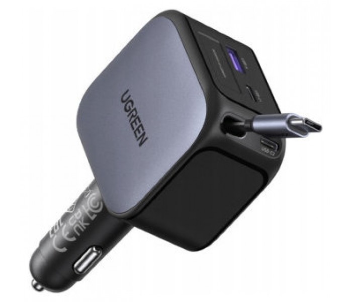 UGREEN 145W 3C1A FAST CAR CHARGER WITH RETRACTABLE USB-C CABLE.