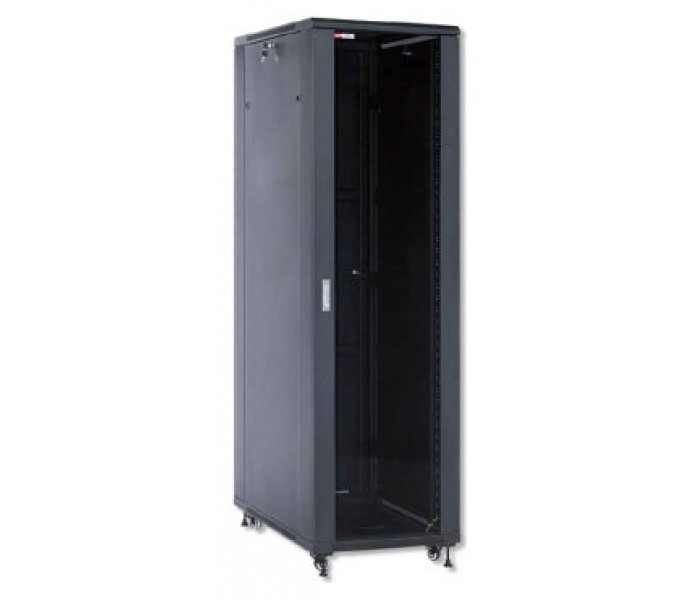 La puerta de cristal templado, el armazón de acero de 2 mm, los cierres (también en los paneles laterales desmontables), las 4 ruedas y las 4 patas de nivelación convierten esta serie en una solución sencilla y con todo lo necesario para su instalación.