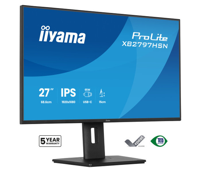 iiyama ProLite XB2797HSN-B1. Diagonal de la pantalla: 68,6 cm (27"), Resolución de la pantalla: 1920 x 1080 Pixeles, Tipo HD: Full HD, Superficie de la pantalla: Mate, Relación de aspecto nativa: 16:9, Ángulo de visión, horizontal: 178°, Ángulo de visión, vertical: 178°. Altavoces incorporados. Conector USB incorporado, Versión de conector USB: 3.2 Gen 1 (3.1 Gen 1). montaje VESA, Ajustes de altura. Color del producto: Negro